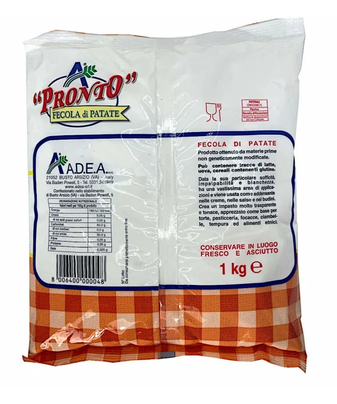 La fecola si ottiene dalla patata essiccata e macinata. E' bianca e impalpabile e si può utilizzare al pari degli amidi, rispetto ai quali l'effetto è più colloso.