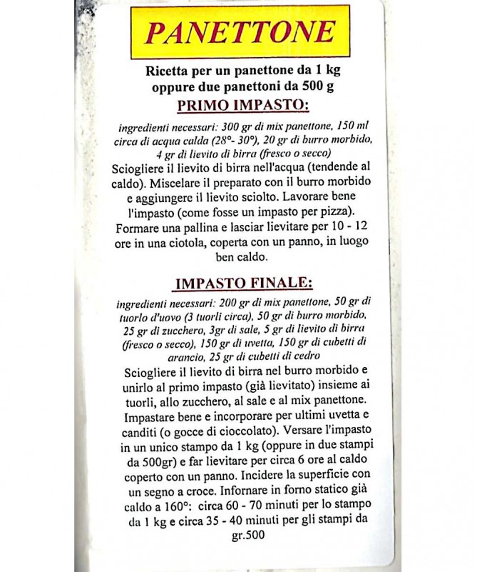 Impasto sufficiente per realizzare un panettone da kg 1 oppure due panettoni da g 500 ciascuno.