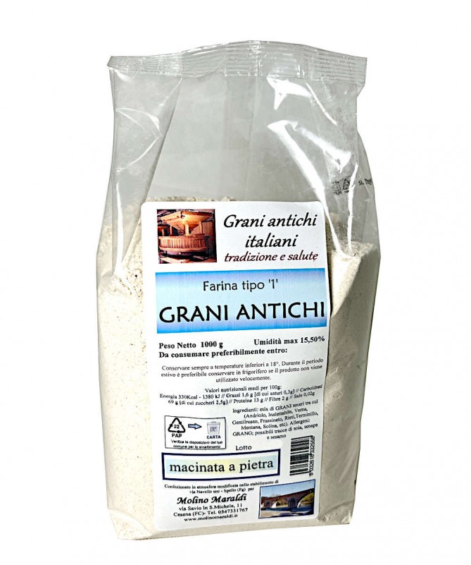 Farina ottenuta dalla macinazione tradizionale a pietra di una miscela di grani teneri di varietà "antiche" quali Andriolo, Inallettabile, Verna, Gentilrosso, Frassineto, Rieti, Terminillo, Mentana, Solina, etc.