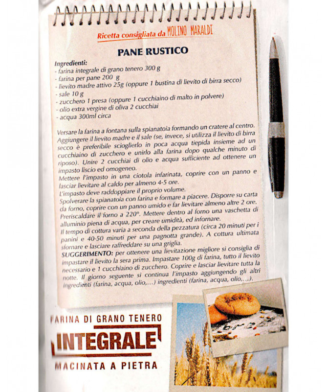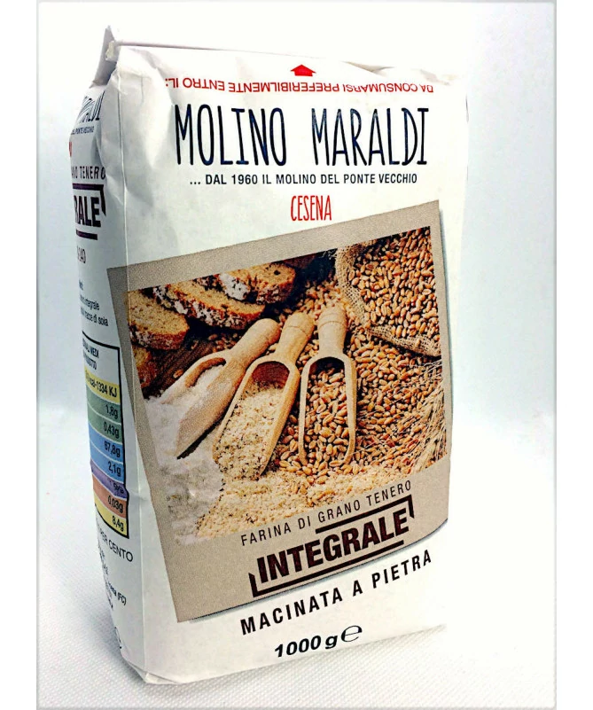 La farina di grano tenero integrale Molino Maraldi è ottenuta mediante macinazione a pietra dell'intero chicco di grano. Pertanto ne contiene tutte le parti, compresa sia la crusca sia il germe di grano.