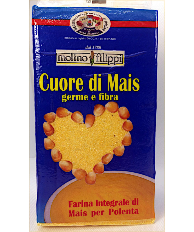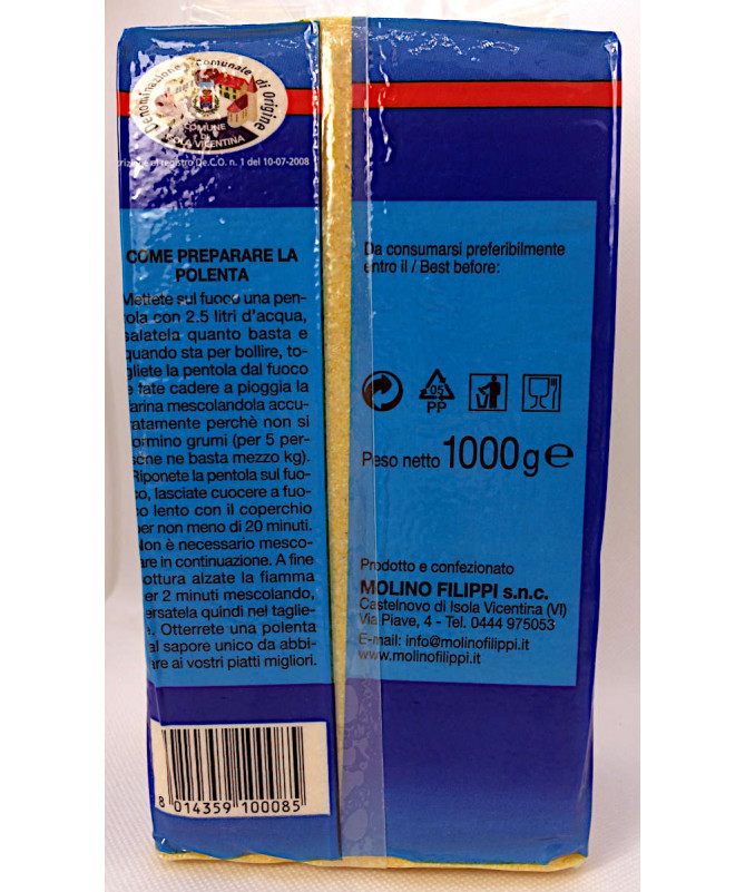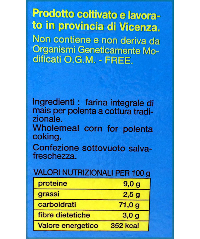 Farina integrale di mais per polenta. Prodotto italiano coltivato e lavorato in provincia di Vicenza.