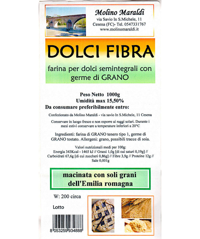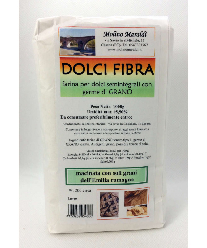 Dolci Fibra è una farina appositamente studiata per la produzione di dolci semi-integrali. E' costituita da farina di grano tenero tipo 1, addizionata con germe di grano tostato.