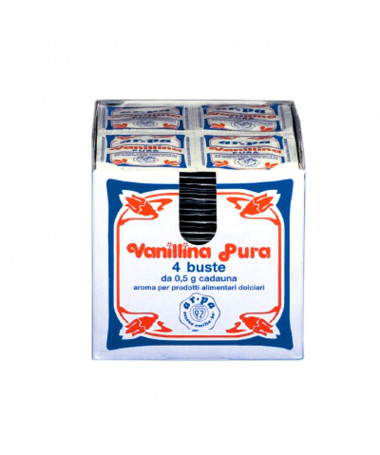 Vanillina pura in pratiche bustine monodose da 0,5 g ciascuna. Ogni acquisto si riferisce ad un foglio da 4 bustine.