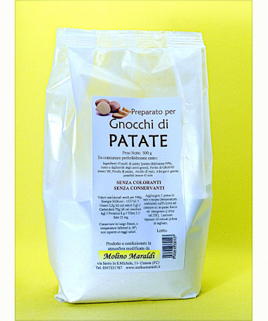 Il Preparato per GNOCCHI DI PATATE di Molino Maraldi è un mix finissimo a base di fiocchi di patate disidratati, farina di grano tenero 00, fecola di patate e amido di mais, con il quale si possono preparare facilmente e in pochissimi minuti i tipici gnocchi di patate.