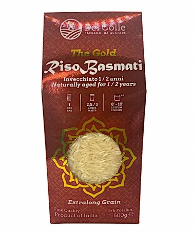 Riso BASMATI dal chicco lungo (long grain). Invecchiato 1/2 anni, si distingue per un sapore delicato ed un aroma intenso. Coltivato in India alle pendici dell'Himalaya, selezionato e stagionato per uno/due anni.