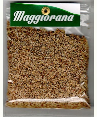 Foglie di maggiorana essiccate e frantumate. La maggiorana è un'erba officinale utilizzata in cucina in svariate preparazioni, ma dà il meglio di sé nella cucina mediterranea. Viene spesso paragonata all'origano ma ha un sapore più garbato, più vicino al timo.