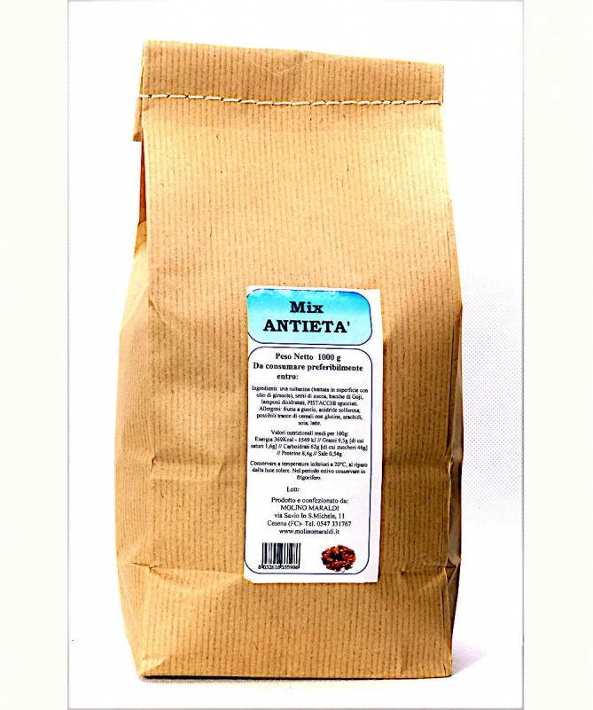 semi di zucca, uva sultana (trattata in superficie con olio di girasole) bacche di Goji (anidride solforosa), mirtilli rossi disidratati (zucchero di canna, olio di girasole), pistacchi sgusciati