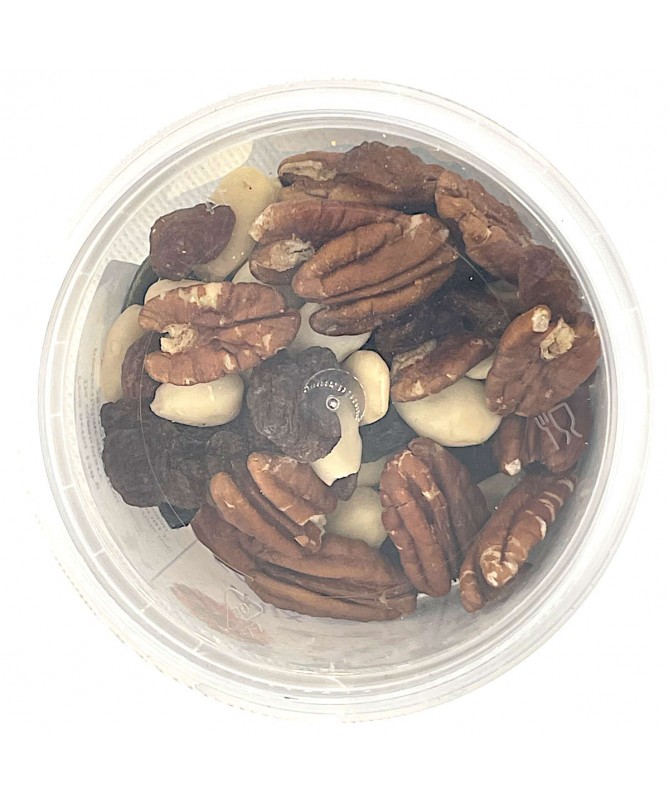 uva sultanina (trattata in superficie con olio di girasole), semi di zucca, mandorle pelate, noci pecan, more di rovo,
