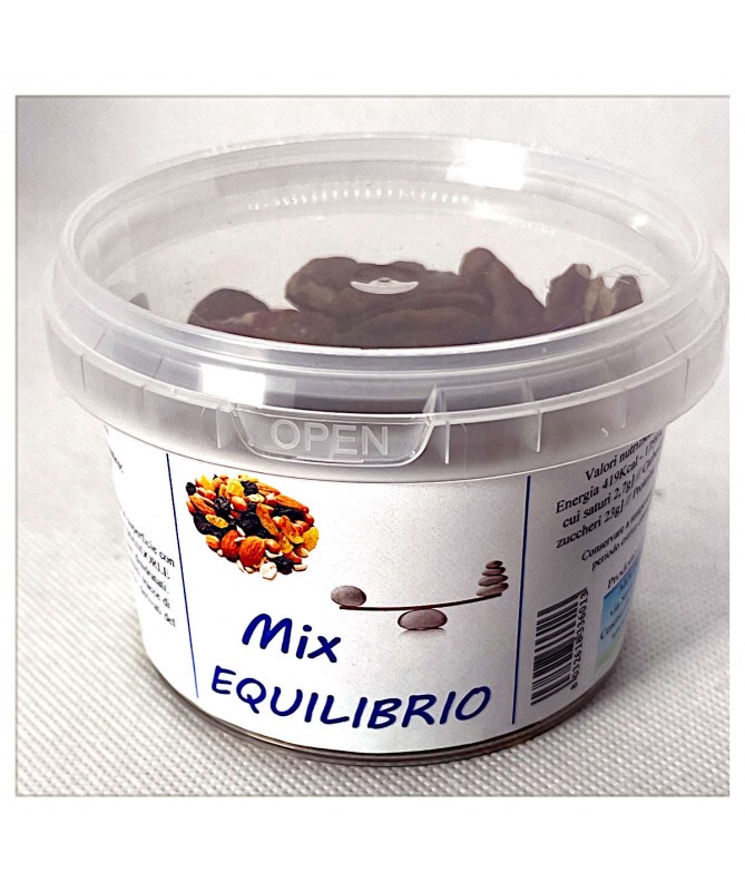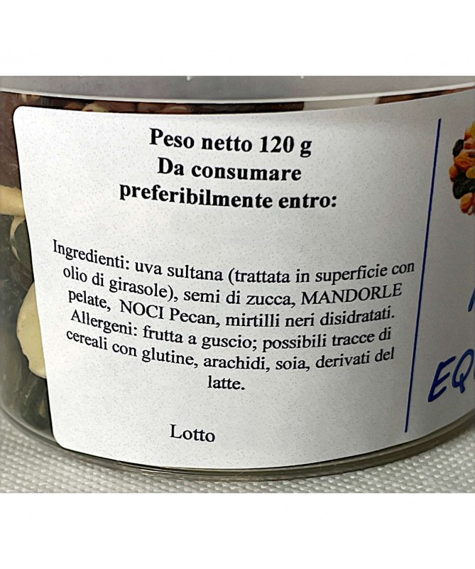 Gustoso Mix Equilibrio, composto principalmente da uvetta, semi di zucca, mandorle, noci pecan, more di rovo.