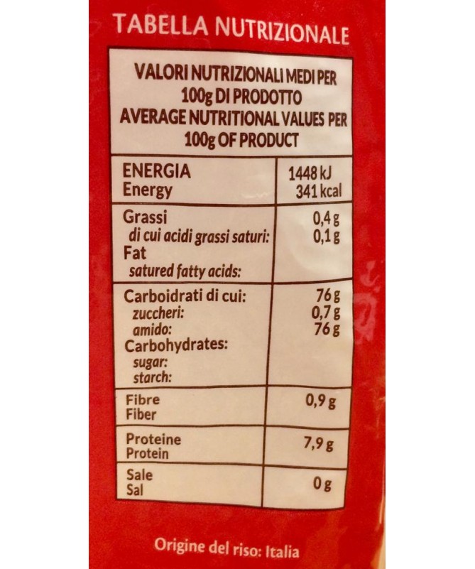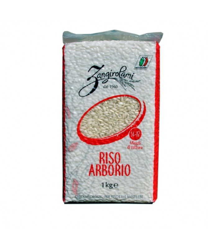 Riso arborio coltivato e lavorato in Italia. caratterizzato da chicchi grossi è ideale per piatti tradizionali come risotti e minestre.
