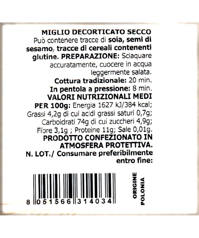 Il miglio è un cereale, di dimensioni piuttosto piccole, naturalmente privo di glutine. Considerato un alimento povero e molto diffuso in Asia e Africa, negli ultimi tempi si sta diffondendo anche nell'alimentazione degli Europei. E' ricco di sali minerali.