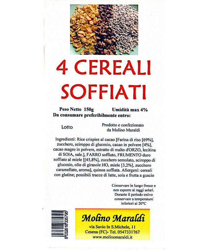Miscela di 4 cereali: riso soffiato al cacao, farro soffiato, grano duro soffiato al miele, e quinoa soffiata.